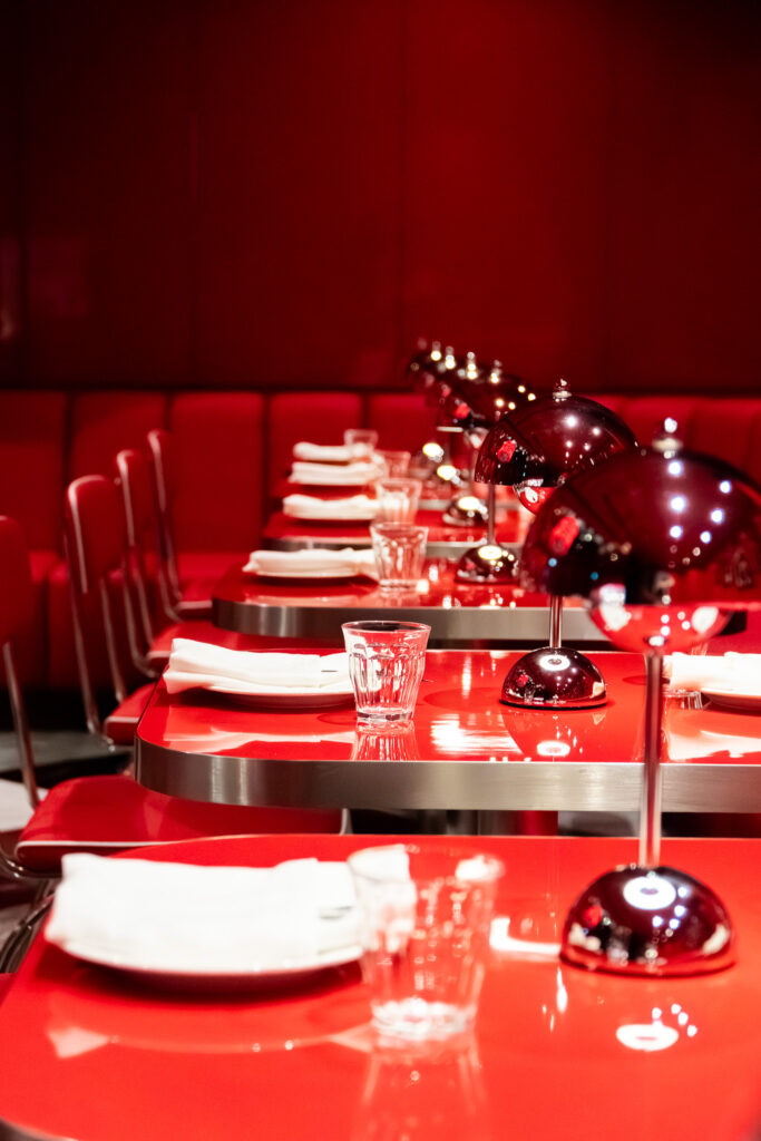 Crimson Hues: A striking palette of deep reds across our walls and plush booths.